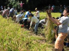 どろんこ教室で刈る 稲を乾燥(はせ掛け)するスペースを確保するため、一枚の田んぼの稲刈りを行いました。稲刈り機の入らない田んぼの端の部分は人手で、他は機械で刈り取りと結束を行いました。