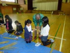 初音ヶ丘小学校は、三村指導者が5年生の授業として春から米づくりを指導してきました。その延長で今回、わら細工を行うことになり、元気村実行委員が一緒にわら細工の指導を行いました。