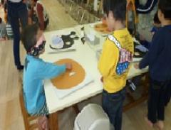 『リース』は三つ編みができればほぼ完成のもの、大多数の女子児童は三つ編みを知っていて、編み方も知っている様子でしたが、男子児童は分からないと答えていました。始めに元気村実行委員がデモンストレーションで編み方の指導をしたあと、早速、あらかじめ偶数の人数で分けてあったグループの各々に元気村実行委員が入り作製にとりかかりました。
