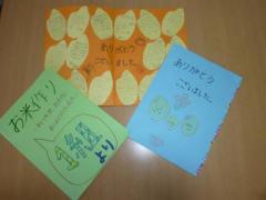 この会のため、お米作りを振り返るスライドを作り、寸劇を用意し披露してくれました。その他にも、「世界に一つだけの花」の替え歌で、「お米の歌」も作り聴かせてくれました。(とても良くできた歌詞でした)そして、お米に関するクイズや、ゲームも自分たちで考えていて、実行委員も一緒に楽しませてもらいました。ゲームは、ゲーム中に「お米づくりで楽しかったこと」を言うという工夫をこらしたもので、児童達から「稲刈りが楽しかった」「夏休みの水やりが楽しくできた」「リース(わら細工」)が作れて楽しかった」などの声が聞かれました。おむすびをいただく時は、児童がお米の形に座り、その間に実行委員も入って、一緒にいただきました。お米そのものの味が味わえるようにと、味をつけていないおむすびでしたが、甘味を感じる美味しいおむすびでした。