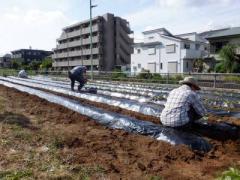 畑に畝作りマルチ張りを行い、約500本の苗を植えた。