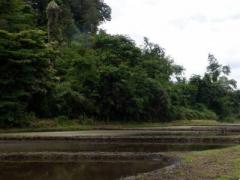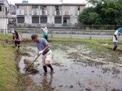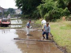 6月6日(土)に畔の整備を行ったので、今日は三村指導者がトラクターを使って代かき、そのあとを実行委員が紐のついた角材を引っ張り、土ならしを行いました。さすがに誰も転ぶことはありませんでしたが、膝上まで泥だらけ!お疲れさまでした。終了後の田んぼは、直後なので水は濁っていましたが、木々が水面に映り、農場に沼ができたようになっていました。