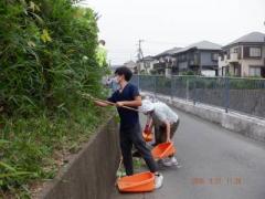 学校橋から鷲山橋まで、道路のゴミ清掃、草刈り、道路にはみ出した植物の枝葉、蔓などを切り取った。