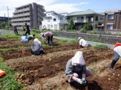 7月4日、どろんこ教室生徒が収穫する畝を残し、お土産用のジャガイモを収穫、袋詰めを行った。