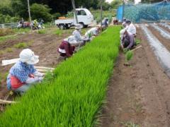6月12日(土)実施のどろんこ教室に欠席した4名が来場。三村指導者、実行委員の指導のもと、自分で育てた苗と実行委員会が準備した苗を田んぼに植えた。