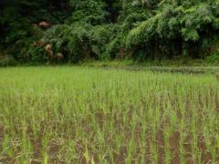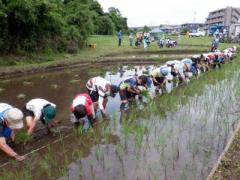 初音ヶ丘小学校5年生、3クラス、105名の田植え支援活動を行った。