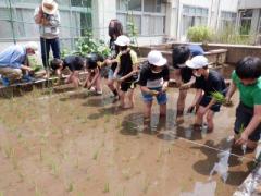 初音ヶ丘小学校5年生、3クラス、105名の田植え支援活動を行った。
