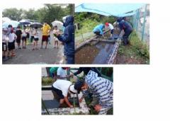 手元で4本数えるのに手間取ったり、植える位置が印を使って分かりやすくしてあるのですが、ちょうどよいところに植えられなかったりで、実行委員からダメ出しが出たりしましたが、みんな一生懸命取り組んでいました。途中、大雨となり、田植え中雨に濡れないように張ってあったブルーシートが雨の重みで突然落ちたり、溜まった雨水がドサッと落ちたり、ちょっと大変な状況になってしまったのですが、それでテンションがあがり、それはそれで楽しい?思い出深い田植えになったのではないでしょうか? ずぶ濡れの田植えでした。
