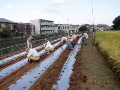 前段で、三村指導者と友田副村長が畝作りとマルチ張りを済ませてくれた。(お疲れ様でした!)