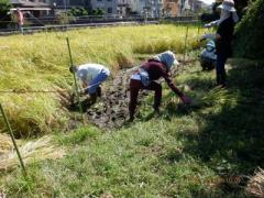 の田んぼの一部稲を刈り、田んぼ内に水路を