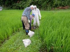 1.の土嚢を使用し、上の田んぼの水漏れ箇所を補修した。