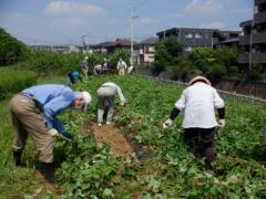サツマイモの蔓が四方八方に伸びて、土に接触した所から根を出している状態。又、隣の畝の蔓とからまっていたりで、このまま放置すると本来のイモに栄養が届かず大きなイモが育たないので、伸びた蔓を土から引きはがし、反対側に返す必要があると、作業の目的・方法を三村指導者に教わり、畑の両サイドからみんなで実施。途中休憩をはさみ、約1時間弱で終了。