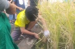 稲場の排水溝の上面が高く、水切りが不十分。稲の根元には数センチの水がたまっていた。田んぼに入ることが出来ず、児童たちは田植えのときと同様、渡し板の上に乗って稲刈りをした。