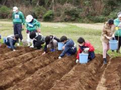 村長の開会のあいさつ後、三村先生にジャガイモの植え方を教わり、畑に移動。一部畝を作らず残しておいた畑で、友田副村長が事前に実行委員が準備した畑の畝作りについてデモンストレーションつきで説明した。その後種イモを植え付けた。参加者が25名と少なめだったので、一人1列、一斉にスタートした。今年は今までと逆で切り口を上に向けた逆さ植え(その方が強い芽が出るという説ありとのこと)出だしは15cm空け、その後は30㎝の棒を使って、等間隔でイモを置いていく。最後もギリギリまで植えずに15cmを空けますと説明があった。置いたイモを踏まないように注意しながら、みんなきれいに置くことが出来ていた。その後は腐葉土を置き、そのうえから肥料を撒く。あっちこっちで、『それ少ないよ』『イモ踏まないで』等声がかかっていた。最後は足を使って土を平らになるように戻して終了。