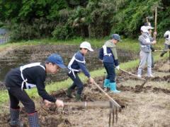 田植えの前の田んぼを作るため田起こしをする事や危険のない様に、鍬の持ち方、足の位置、鍬のおろし方、隣の人との間隔をあける事等、説明があった。
