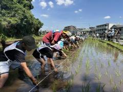 《記事》初音が丘小学校5年生3クラス児童(約90名)の田植え支援を行った。