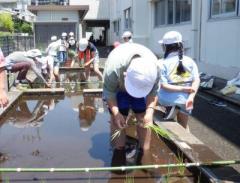 1人3株植えて印のついた棒を一段さげ、さらにもう3株と計6株植えて次の人と交代するかたちで植えました。『後ろにさがったらちゃんと足跡をならしてね』と声をかけられながら上手に植えていました。全員終わってあと少し残ったところは「もう1回やりたい人!」と声かけ、(多数の手が)じゃんけんの結果3名が2回目を植えました。順番を待っている間は前の児童が植える様子をちゃんと見ていて、どの児童も何度も同じ注意を受けることなく整然と出来ていました。終了後、みんな楽しかったと。三村指導者からは、この後の稲の成長について話があり、生徒からはどのくらいの水が必要かとか、収穫量はどのくらいかなどの質問がありました。『ちゃんとスズメ対策をしないと収穫量がほぼ0ということもあった』という話に、児童達はエ~とビックリ。というわけでちゃんとネットを張って下さいネ!『収穫したお米は、何もつけない白ご飯で食べてみるとお米の味が一番分かります』と言われ、みんな食べる時のことが頭に浮かんだようです。毎日稲に『おはよう』『さようなら』と声をかけて下さいという話もありました。