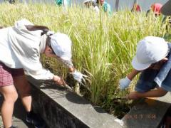 そして田植えで一人4株植えたので、稲刈りも一人4株となりました。先に2組から自分達が田植えをした場所の稲刈りをスタート、その間1組は教室で三村指導者から聞いた話のまとめなどをしながら待機、2組が終わったら交代となりました。