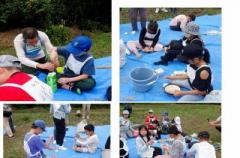 ①ラジオ体操後、グループ別集合:前回どろんこ教室の観察記録の発表と振り返り