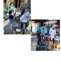 ③餅つき・大根の収穫:最初に赤・黄組から餅つき開始。手洗いをすませ、CAP・マスクを着用して順番に餅つきにチャレンジ。田植え、稲刈りと自分たちが育てたもち米での餅つきです。最初は杵が重い!真っ直ぐに振り下ろすのが難しい!と苦戦する姿も見られました。それでも杵の持ち方やつき方のこつなどのアドバイスを受けると、子どもたちは姿勢を整えながら一生懸命に取り組んでいました。