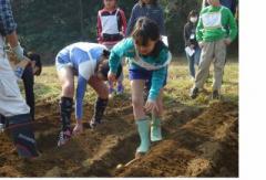 実行委員が鍬で畑に畝を作っているのを見学し、グループ別に植付け開始です。切った種イモの芽の方を上に(反対に置くと芽が出るのに時間がかかると先に説明がありました)、畝の両端といも同士の間隔