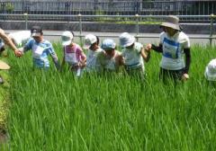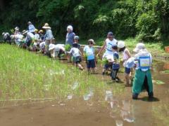 稲の根を足で踏むようにしながら、手をつなぎ横一列になり進みました。『雑草を抜きながら、足で踏んで稲の根を切ることで、そこから、又、根が育ち丈夫な稲になります』と話がありました。