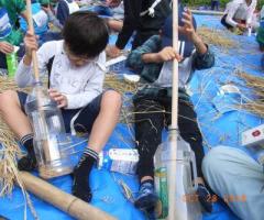 牛乳パックに稲穂を差し込み、パックのクチを押