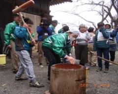 2グループに分かれて一人10回ずつ餅をつきました。
