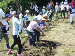 写真拡大 実際に鍬を手にしてやってみると、なかなか真っ直ぐおろせず、また鍬が土から抜けないなど悪戦苦闘。中には背丈が鍬と同じくらいの生徒もいましたが、力強く鍬を使っていて、やっぱりコツが大事!