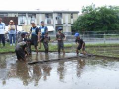 最後は、角材を使っての土ならしです。表面を平らに滑らかにするためです。息を合わせてやらないと、なかなか進みません。この時点では、みんな泥だらけでゼッケンの名前が見えないのはもちろん、何色の服かも分からない状態・・。