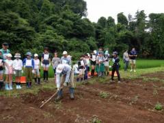 昨日の雨で畑の土は湿っています。実行委員が先に畝にクワを入れ、ジャガイモを掘り出しやすくしました。