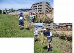『台風15号によって、元気村農場周囲の木も倒れたり、折れたり、傾いたりそして収穫を前に稲も倒れてしまいました。でも、稲穂は無事、稲穂がついているから倒れてしまった(上の方が重い)とも言えます。』と三村先生のお話、みんなも農場の様子にちょっとビックリしたようです。