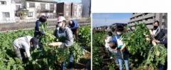 早速各グループ別に敷いたブルーシートの上で、三つ編み開始!
