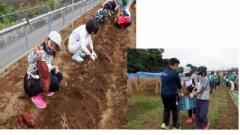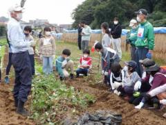 みんなから『イモ!』『種!』という声が聞こえてきましたが、正解は蔓(つる)の部分をさすように植えますと説明がありました。畑の土が見えないぐらい蔓が伸びていてその蔓にたくさん根がついていたのが分かったかな?土の中のいもを大きくするため、実行委員は途中で蔓返しという作業をしました。それをしないと蔓の途中から根をはって栄養が届かなくなるからです。