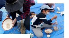 脱穀した籾をすり鉢に入れ、ボールを使ってもみ殻を取り除いていきます。時々フウツと息をかけて殻を飛ばしたよ。ここで、玄米のできあがり!
