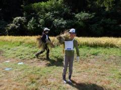 各グループ、最初に稲刈りする班と刈って実行委員が束ねた稲束をはせ掛けのところまで運ぶ班とに分かれて稲刈り開始。