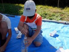 色々な方法、例えば割りばしやお茶碗などを使う方法もありますが、元気村では牛乳パックを使います。とり離した実がバラバラに散らばらないようにするには、今のところこれが一番かな。