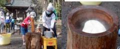 蒸したアツアツのお米を臼にあけて、最初は実行委員が杵でこねていきます。これはとても力仕事。
