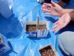三村先生の説明を聞き、各グループ実行委員からの指導を聞き、各自家から持参した牛乳パックに25粒の種をまきました。