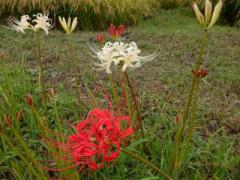 元気村農場入口に彼岸花が咲いていました。珍しい白の彼岸花も!