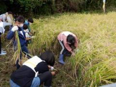 早速割り当てられた田んぼに入り、グループ内でk【稲を刈る人】【刈った稲を並べ、束ねの準備をする・稲架まで運ぶ】の二手に分かれ開始。束ねるのは実行委員。稲株の押さえ方は聞いたものの、やっぱり手の向きがついつい反対になる生徒も。また特に下の田んぼはまだ土がぬかるんでいて、一歩足を進めるのも大変、『切った稲株の上に足を置くといいよ』と実行委員に声をかけられ、『ホントだ!』と。最初は一株毎に並べていたが、3株くらいを手に持って刈ることができるようになり、調子が上がってきていた。途中休憩後役割交代、でもはじめに運ぶ係りだった生徒は、はやく刈る方をやってみたそうで休憩もそこそこで田んぼに移動していた。全部刈り終えるのは難しいかと思われたが、11時頃には全て終了した。