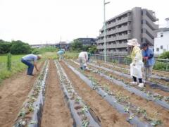 はじめに三村指導者から植え方の指導を受け開始した。マルチに竹棒を差し込み(角度は45度くらい)そこに苗を廻すようにしながら差し込む