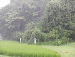 今日はさつまいも畑の雑草刈りと蔓返し、防鳥テープを張るための臨時開村でした。一番暑い時間をさけるため、16時集合としました。が、ちょうどその少し前からポツポツと雨が降り始め、と思ったらすぐにスコールのような大雨に。