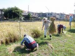 1.稲の束ね方の講習: 三村指導者より刈った稲の束ね方、束ねる時の量や位置の講習を受けた。