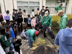 あまりためらうこともなく、比較的スピーディーに刈ることが出来ていました。友達どうしで「手の向きが違うよ!」と注意する場面もあったり、「稲刈り、楽しい!」と和気あいあいに取り組んでいました。束ねるのにも挑戦、これはちょっと難しそうでしたが器用に束ねる児童もいて、周囲で観ていた児童からは「やり方は分かった」の声も。