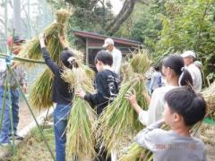 全部刈り終わった後の田んぼに稲架を作り、児童達も一緒にはせ掛け、ネットをかけて終了。