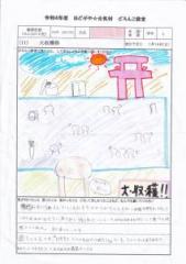 ・最初はわらでみつあみができるか心配でした。でもがんばってきれいにできてうれしかったです。次にかざりつけです。たくさんあってなやんだけど、アイディアがポンポン頭にうかんできて、さいごはきれいにしあがってうれしかったです。
