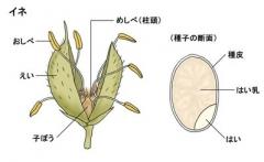 1)外側の穎(えい:もみがらになるところ)が開いて6本の雄しべが伸びる。