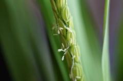 1)外側の穎(えい:もみがらになるところ)が開いて6本の雄しべが伸びる。