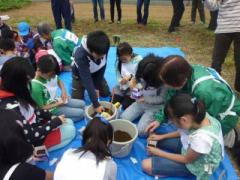 前回のどろんこ教室はわらで「お相撲さん」の人形を製作し、チーム対抗の相撲大会を行いました。多かった声は製作過程の『三つ編みが難しかった』でした。相撲大会では『大きいのを作ったけどすぐ負けてしまった』『でかいのは2秒で倒れた』と必ずしも大きさが勝負の鍵ではないことが分かった様子。又、『大人も相撲大会に参加させるのはずるい!』という意見もでました。でも『楽しかった』『わらであんな面白いことができるとは思わなかった』と、楽しかったが一番多い声でした。